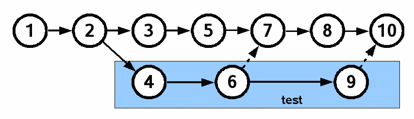 The hypothetical scenario of figure 4 is this: The project starts and progresses to a point where (at check-in 2) it is ready to enter testing for its first release. In a real project, of course, there might be hundreds or thousands of check-ins before a project reaches this point, but for simplicity of presentation we will say that the project is ready after check-in 2. The project then splits into two branches that are used by separate teams. The testing team, using the blue branch, finds and fixes a few bugs. This is shown by check-ins 6 and 9. Meanwhile the development team, working on the top uncolored branch, is busy adding features for the second release. Of course, the development team would like to take advantage of the bug fixes implemented by the testing team. So periodically, the changes in the test branch are merged into the dev branch. This is shown by the dashed merge arrows between check-ins 6 and 7 and between check-ins 9 and 10.