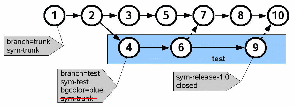 Check-in 4 also has a sym-test tag, which gives the symbolic name "test" to check-ins 4, 6, and 9. Because tags do not propagate across merges, check-ins 7, 8, and 10 do not inherit the sym-test tag and are hence not known by the name "test." To prevent the sym-trunk tag from propagating from check-in 1 into check-ins 4, 6, and 9, there is a cancellation tag for sym-trunk on check-in 4. The net effect is that check-ins on the trunk go by the symbolic name of "trunk" and check-ins on the test branch go by the symbolic name "test."